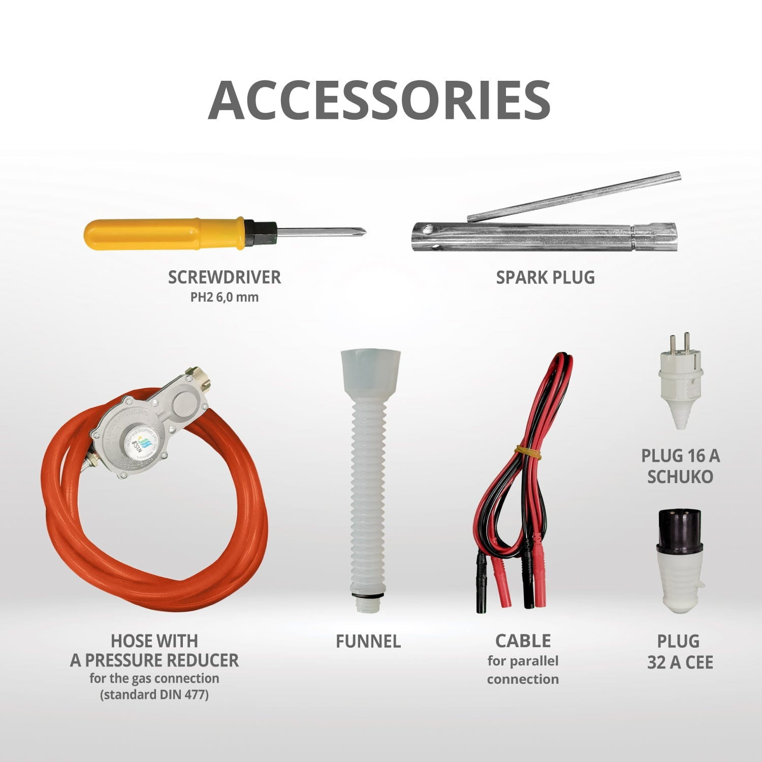 Generatorul este echipat cu accesorii suplimentare: cheie pentru bujii, pâlnie pentru turnarea comodă a uleiului de motor, cablu pentru conexiune în paralel, furtun cu reductor, priză Schuko de 16 A, șurubelniță PH2 de 6,0 mm, stecher 32 A CEE. Butelia de gaz nu este inclusă în pachetul de livrare.